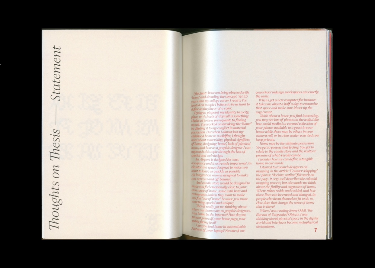 120 diary of research, interviews, art and speculation for what would eventually become my undergratudate senior thesis. Thoughts on Thesis asks questions about home and capitalisms role in graphic design.