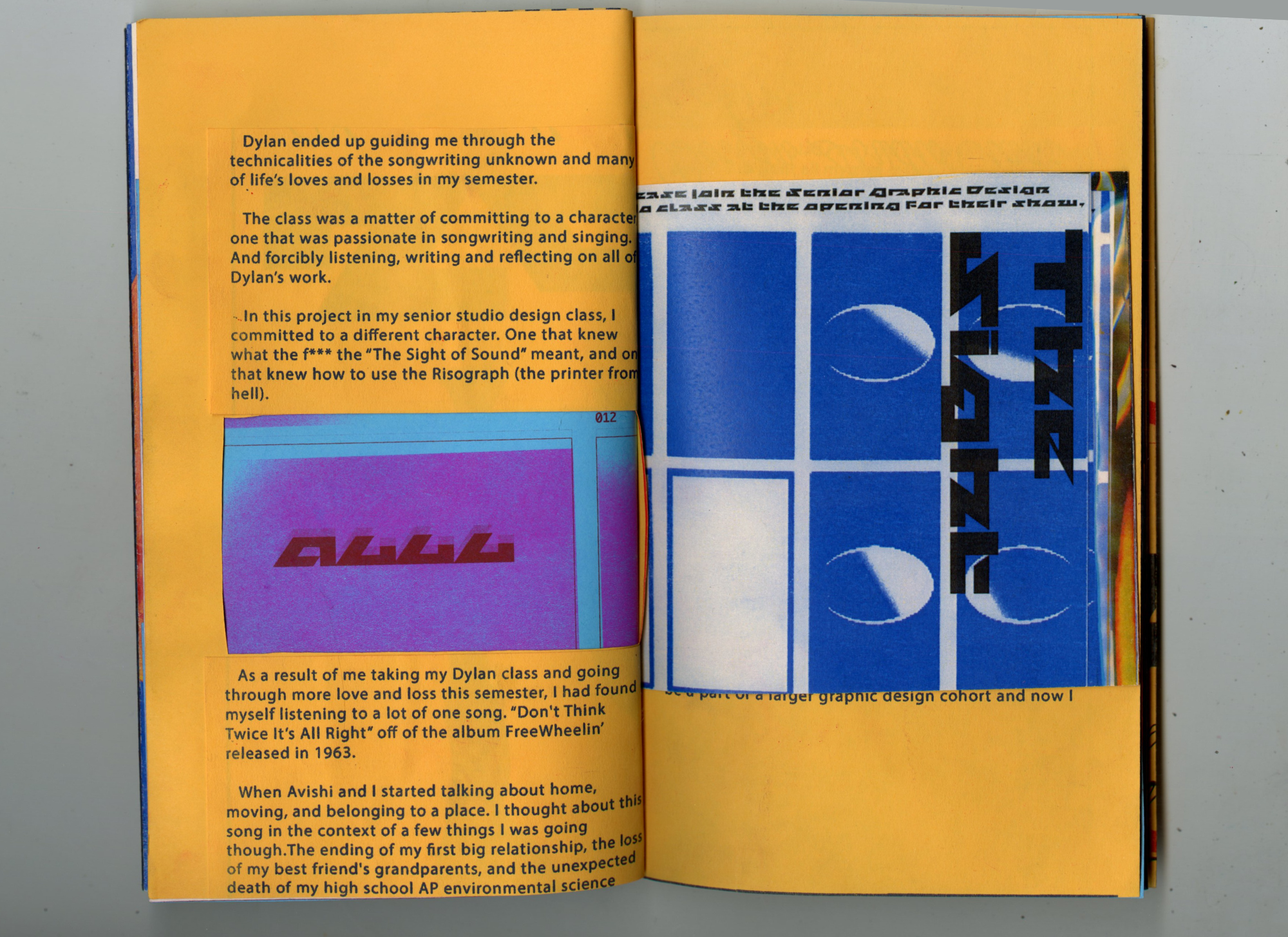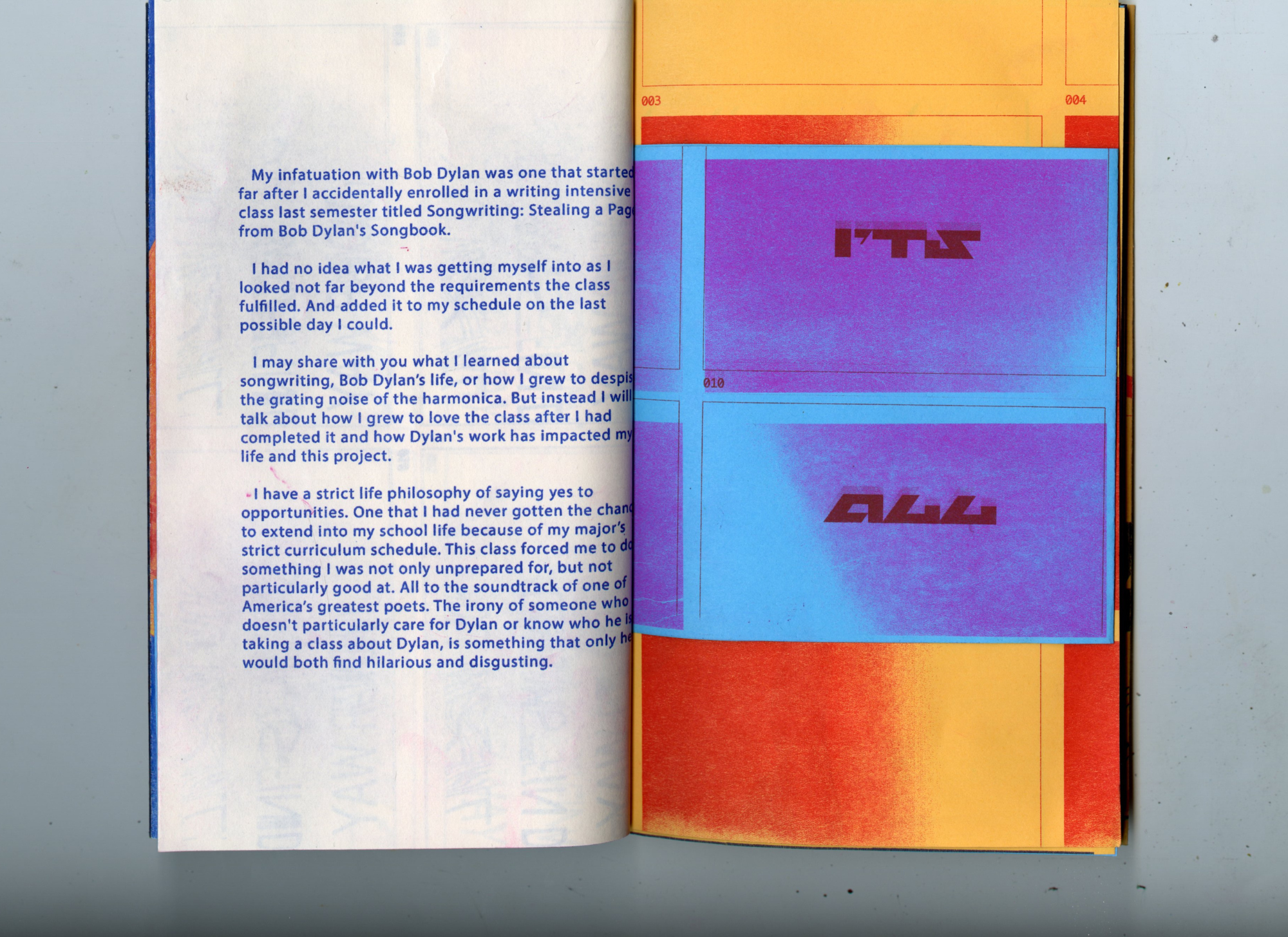 The fall of my senior year I took 7 classes and was overwhelmed with a myriad of topics ranging from experience design to statistics to a course on songwriting, I admittedly signed up for because I thought it would be fun and easy. It ended up being an intense writing course focusing on the work of Bob Dylan, America's greatest songwriter. I had never listened to Dylan, and frankly wasn’t a huge fan of the harmonica, but decided to embrace my awkward songwriting class and commit to the bit.