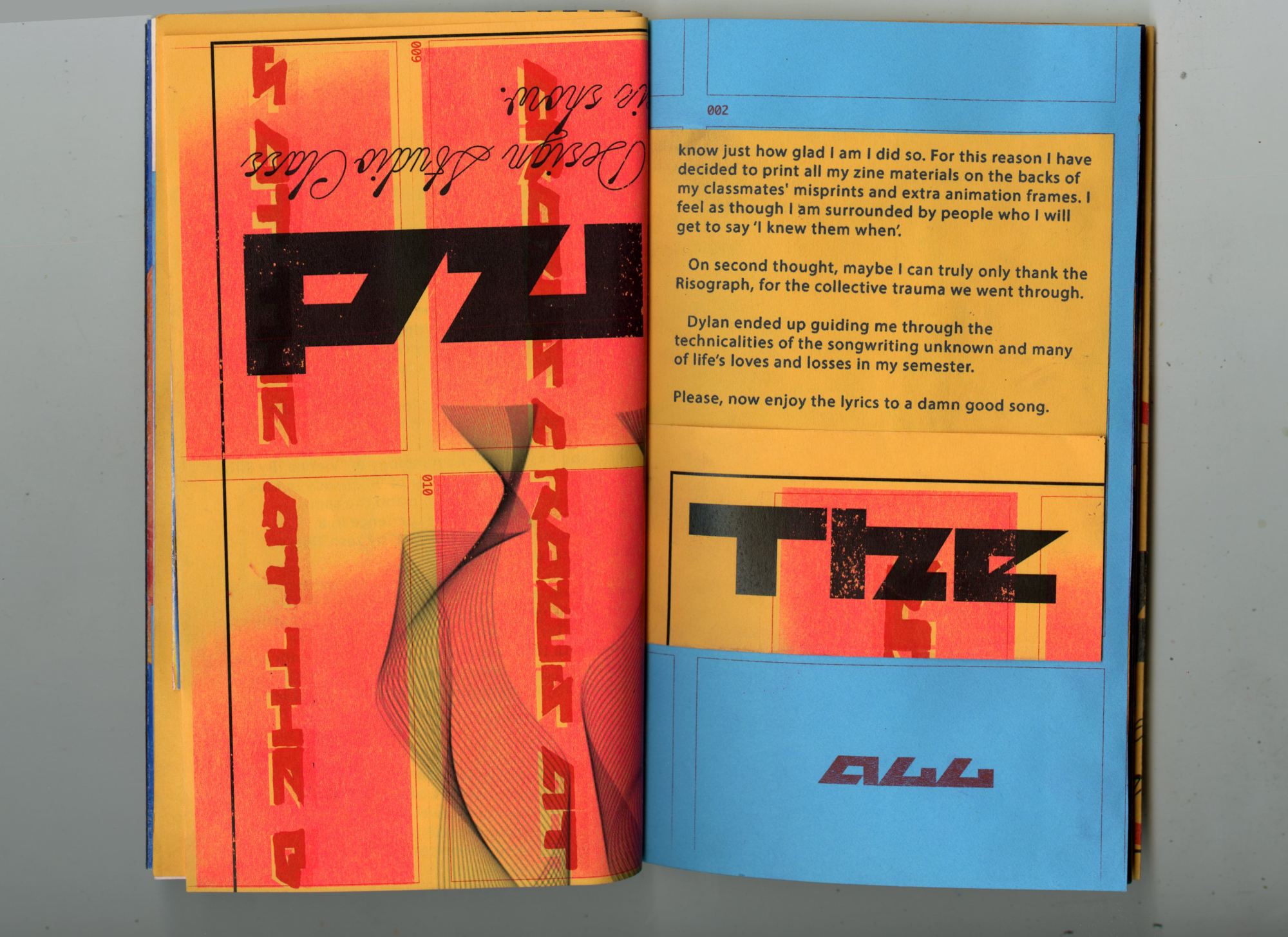 Included a 15 second risograph animation, 2 mixed media and risographed zines, and 20 riso postcards.